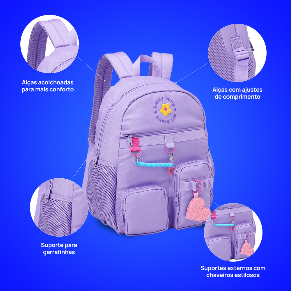 Descrição - Mochila Juvenil Happy Girls Lilás